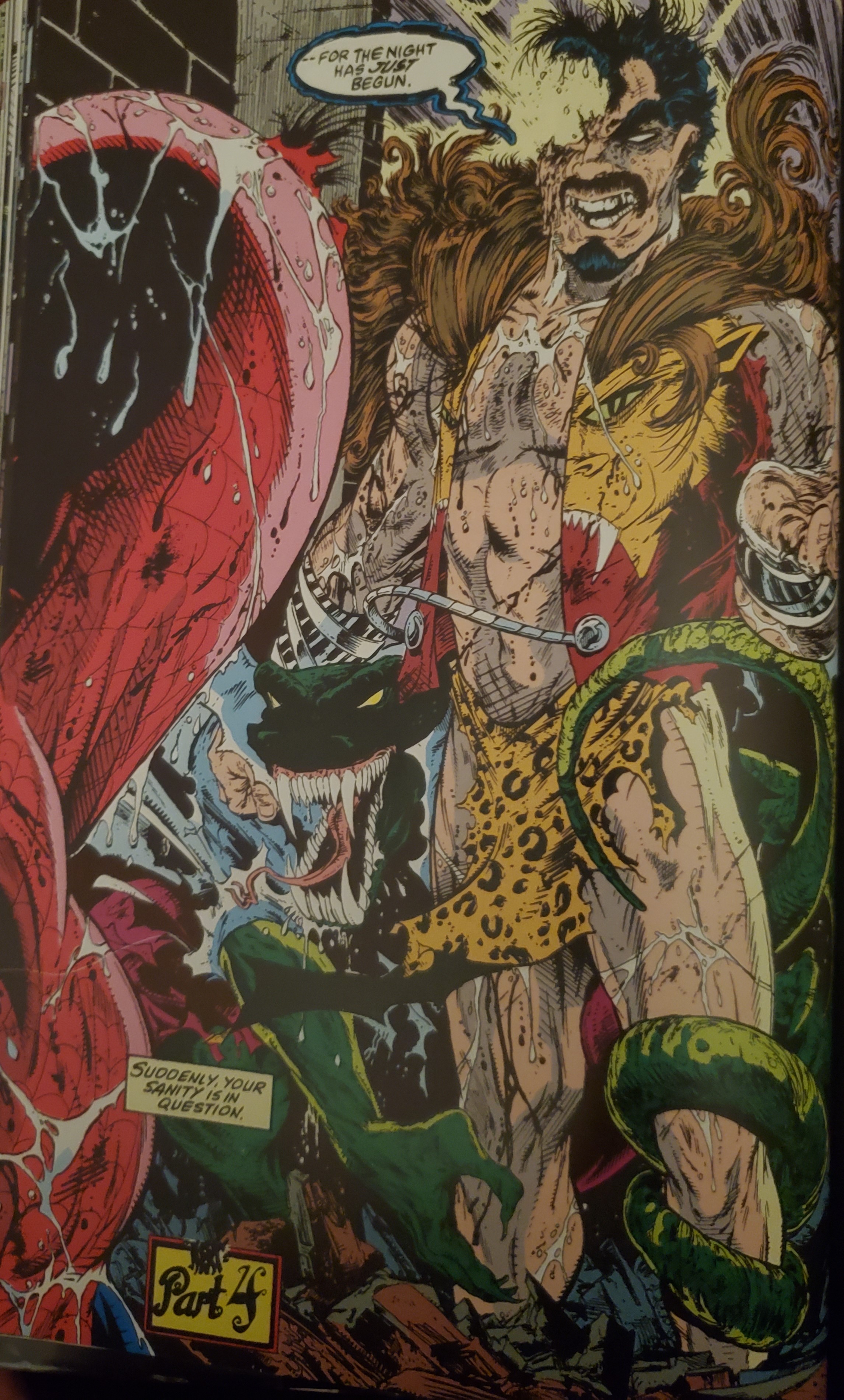 The ultimate blow for “Torment,” is the big reveal of the actual big bad, Calypso Ezili. She has hypnotized the Lizard, and has poisoned Spider-Man to cause his hallucinations of Kraven the Hunter, her belated lover. Ok, sure. At the time I suppose the more interesting Spider-Man villains were indisposed in other books, so McFarlane resurfaces a character that everyone had forgotten. Additionally, I am looking hard at how he draws this character, and I wonder…is she…black??? Because besides Storm (and arguably Shard), dark-skinned black women in comics were simply not allowed in the 90’s. Yet that giant web of hair, full lips, and of course Voodoo magic means that yes, she is indeed black.