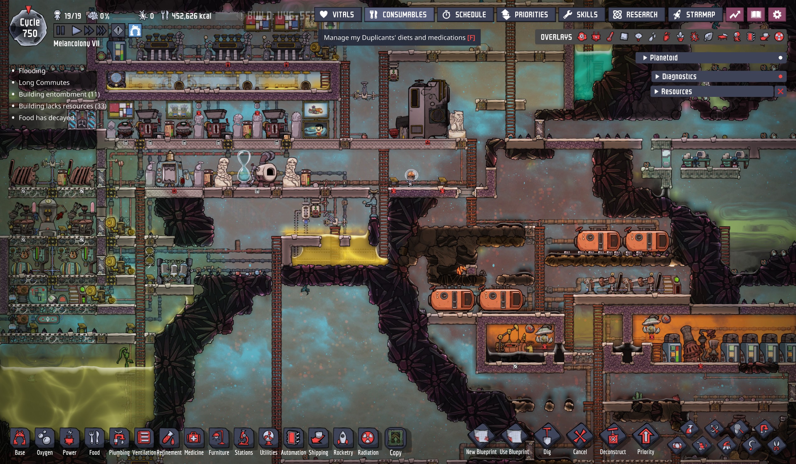 Enter the Spaced Out! DLC. It theoretically provided me with an opportunity to return to ONI, but with options that expedite space-faring. But being the person that I am, I decided to launch Melancolony VII. Yeah, I accidentally skipped VI, but I may go back to it should I decided to run one of those unique Spaced Out! colonies that require space adventures sooner rather than later for resources.