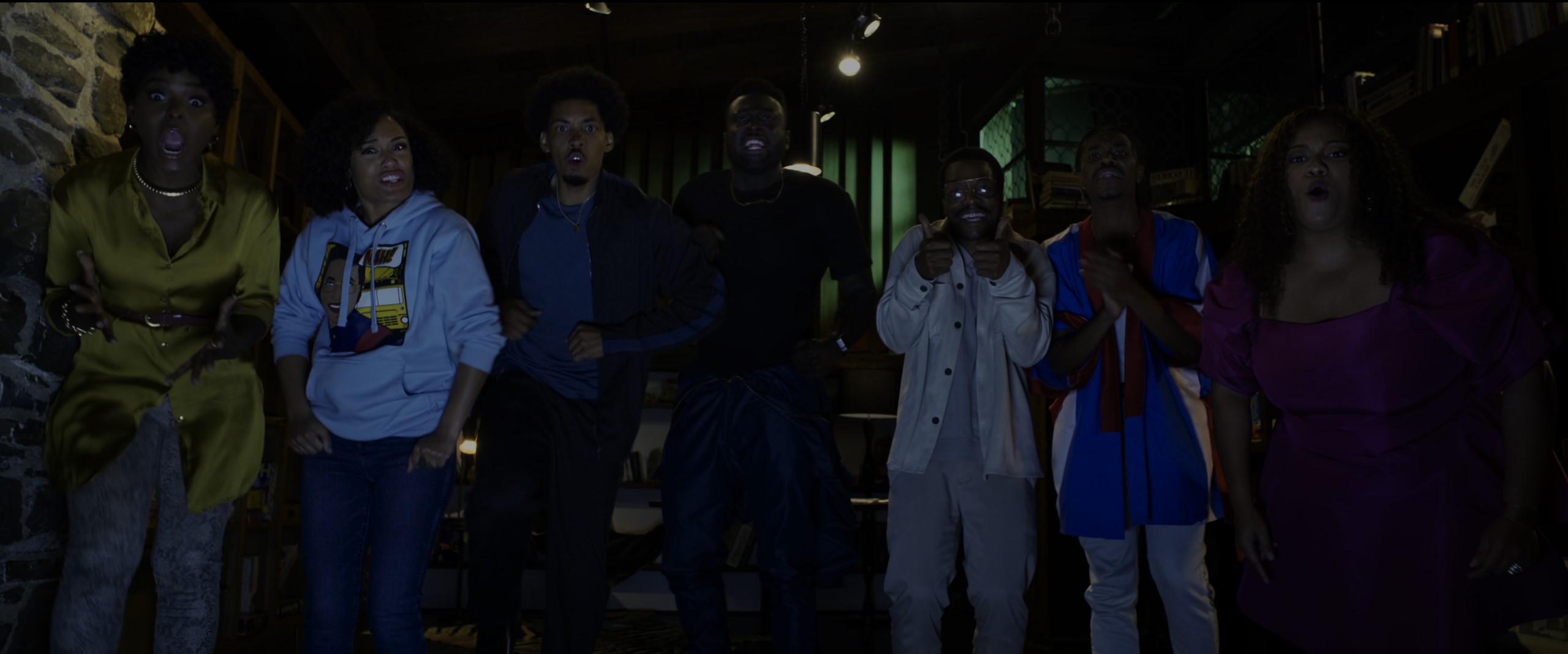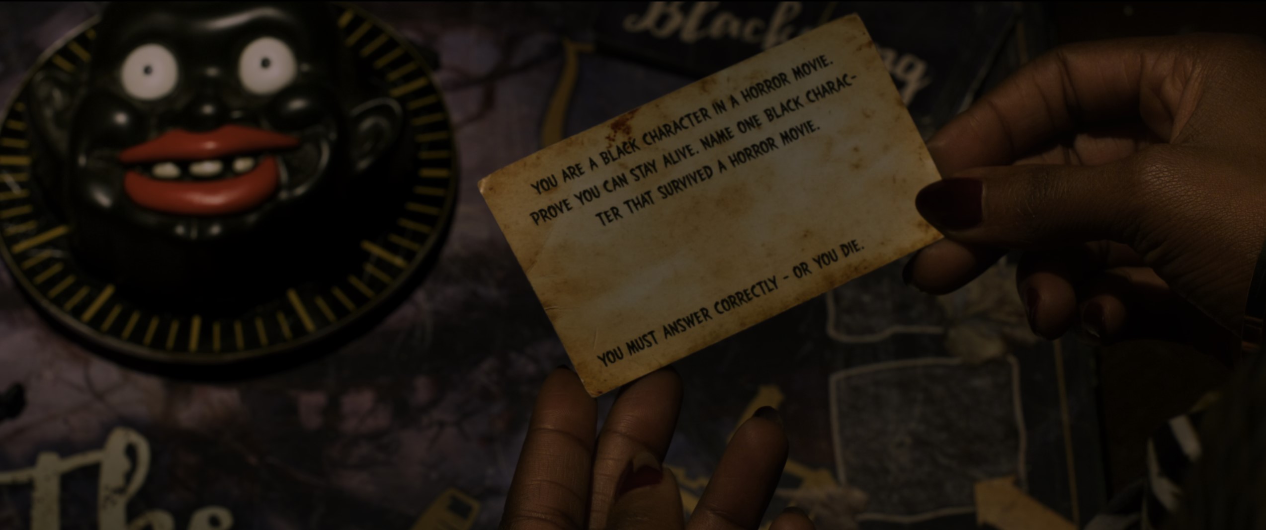This cast of archetypes facilitates conventional horror tropes. The power goes out, and the only illuminated room in the house is the “game room,” the chamber in which two characters succumb during the film’s introduction. Dramatic irony ensues as the dramatis personae engage with the titular board game. Indeed, The Blackening revolves around a board game! Jigsaw rolls over in his grave as the console television cuts on to show a tar baby matching the Sambo figure on the cover of the board game. In order to live, the game threatens, everyone has to play; the gang has to answer questions ranging from what the second stanza of the Black National Anthem is to how many seasons before the dark-skinned Aunt Viv was replaced on The Fresh Prince of Bel-Air.