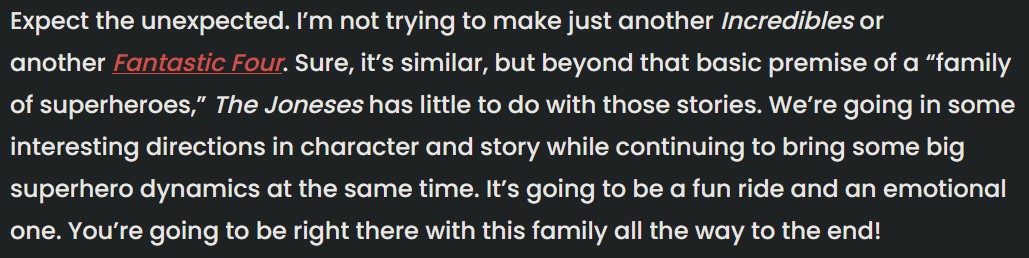 When I reflect on The Joneses, I think about how bad-faith detractors rage about creating original characters of diverse ethnic backgrounds instead of changing the race of established characters. This comic strikes me as a response to said detractors. The effort and the result are milquetoast at best and bootleg at worst. Even one of my kids makes a drive-by comment that the family’s daughter, Agatha, looks like Zendaya. I had not noticed this before they pointed it out, but it’s true and hilarious.