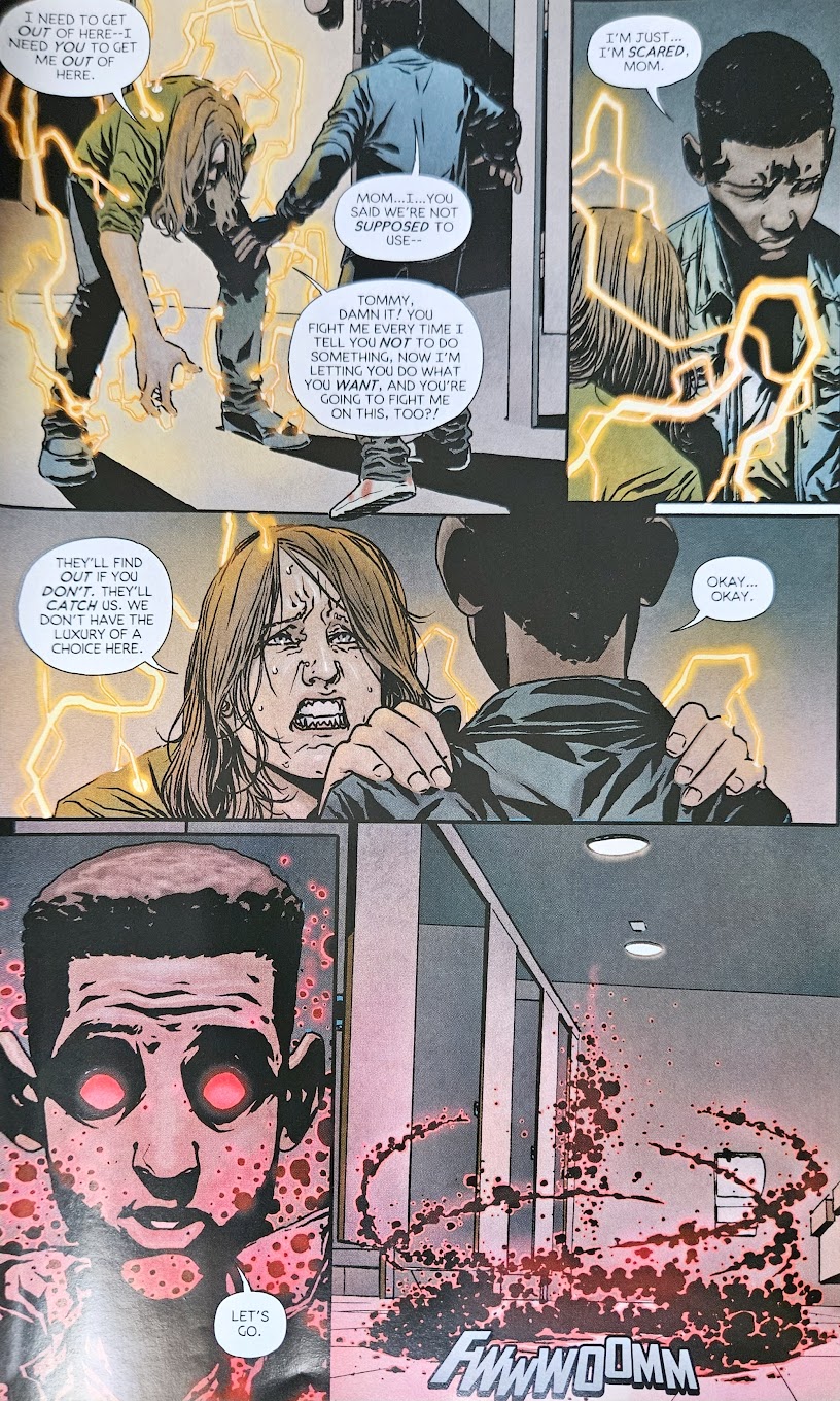 The culminating battle is the most interesting part of this book even if practically everything seems borrowed from a: Marcus’ powers remind me of The Guyver; Agatha is a hotshot like Johnny Storm but with Quicksilver’s super speed; Tommy has the powers of teleportation like Nightcrawler; and Sonya’s abilities, while not as readily identifiable, remind me of an unstable Jean Grey Phoenix. Yet Sonya argues with Marcus like Helen Parr argues with Bob about their powers—he wants to be a good guy while fear paralyzes her. Meanwhile at school, Agatha uses her powers to beat kids who are bullying her little brother, Tommy, moving too fast for them to see who is throwing the punches.