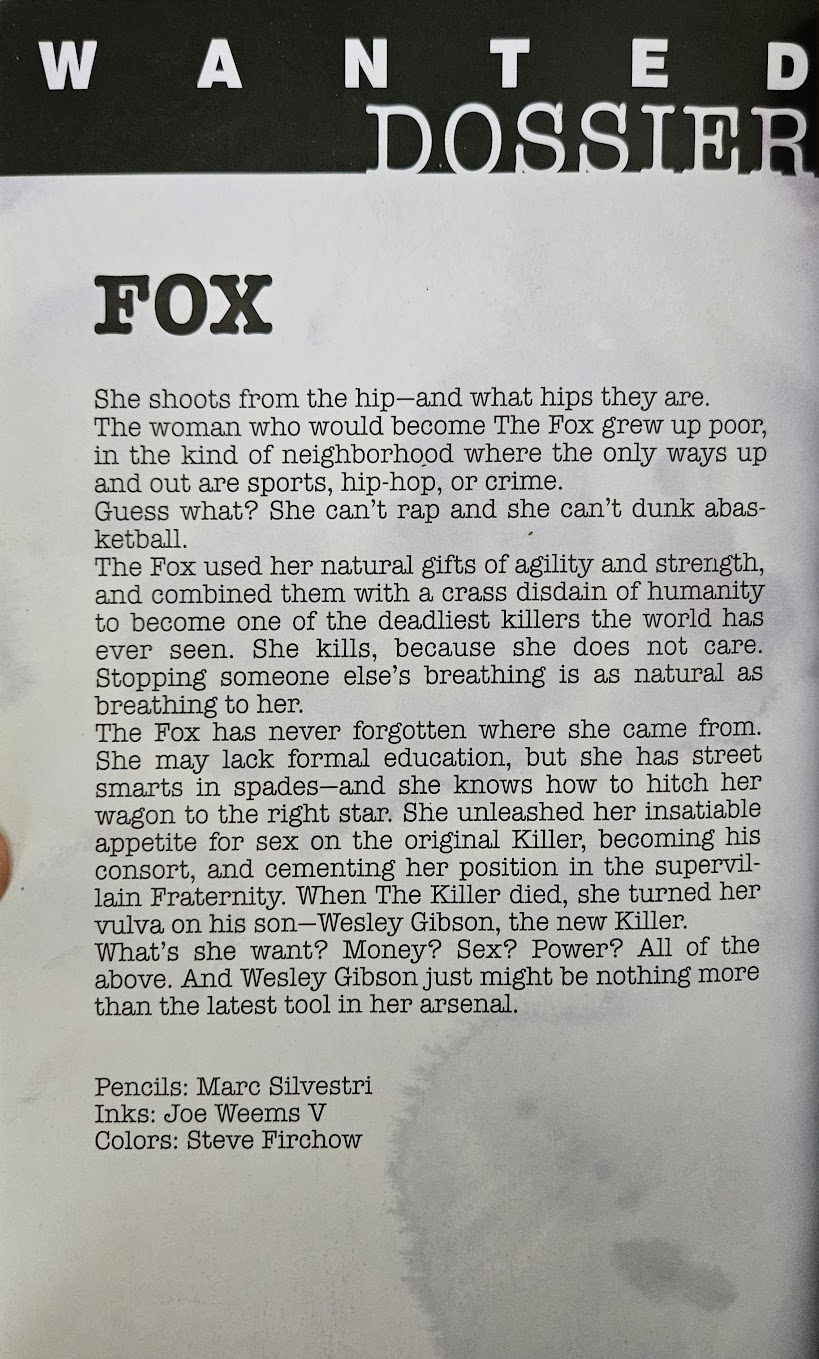 I could not have been more wrong. The character sprinkled around the comic is the Fox, an amalgamation of the Manic Pixie Dream Girl, Magical Negro, and Jezebel figure. While published from 2003-2005, in 2023 Wanted reads like an appeal, anachronistically, to incels, alt-righters, and Comicsgate audiences.