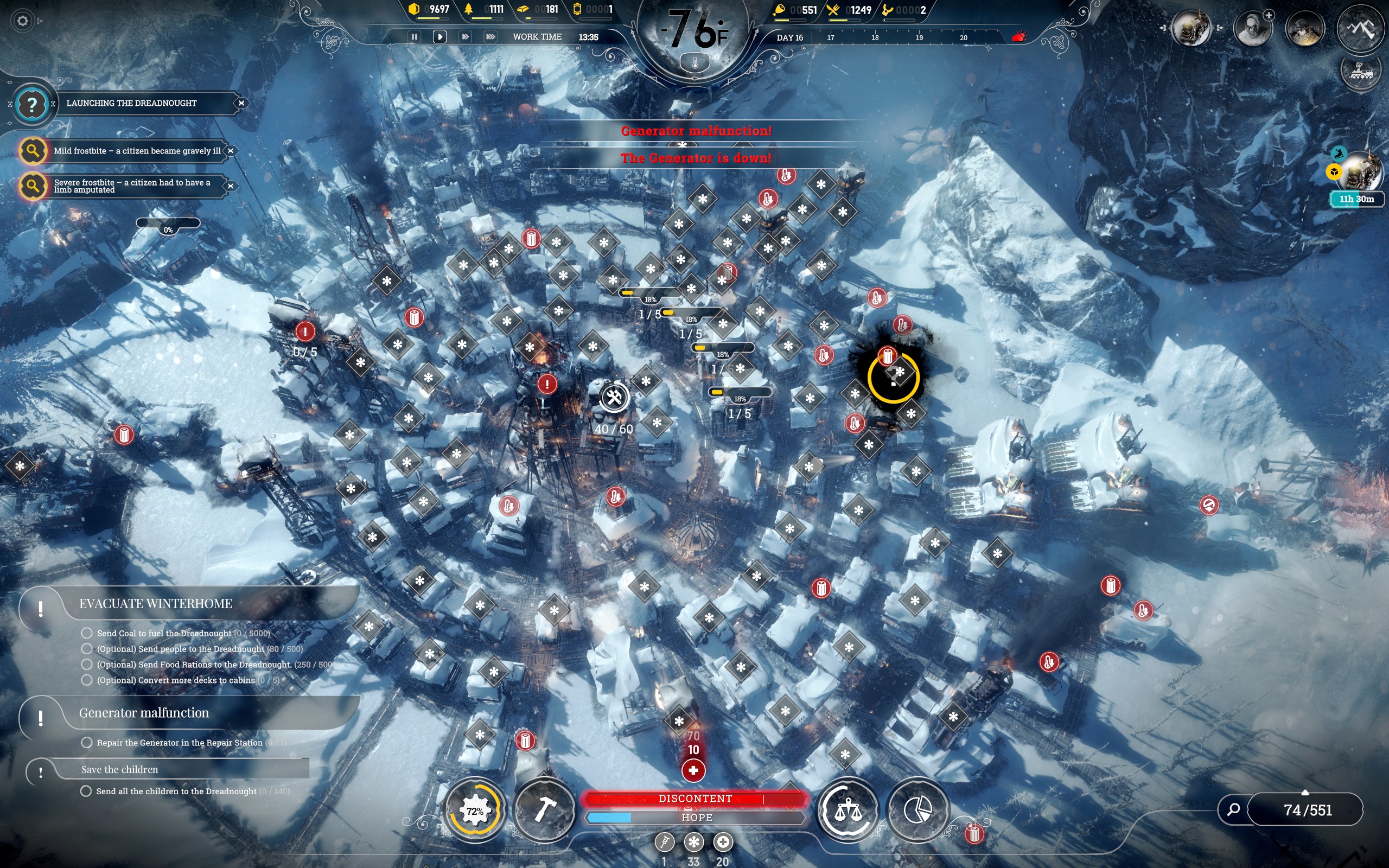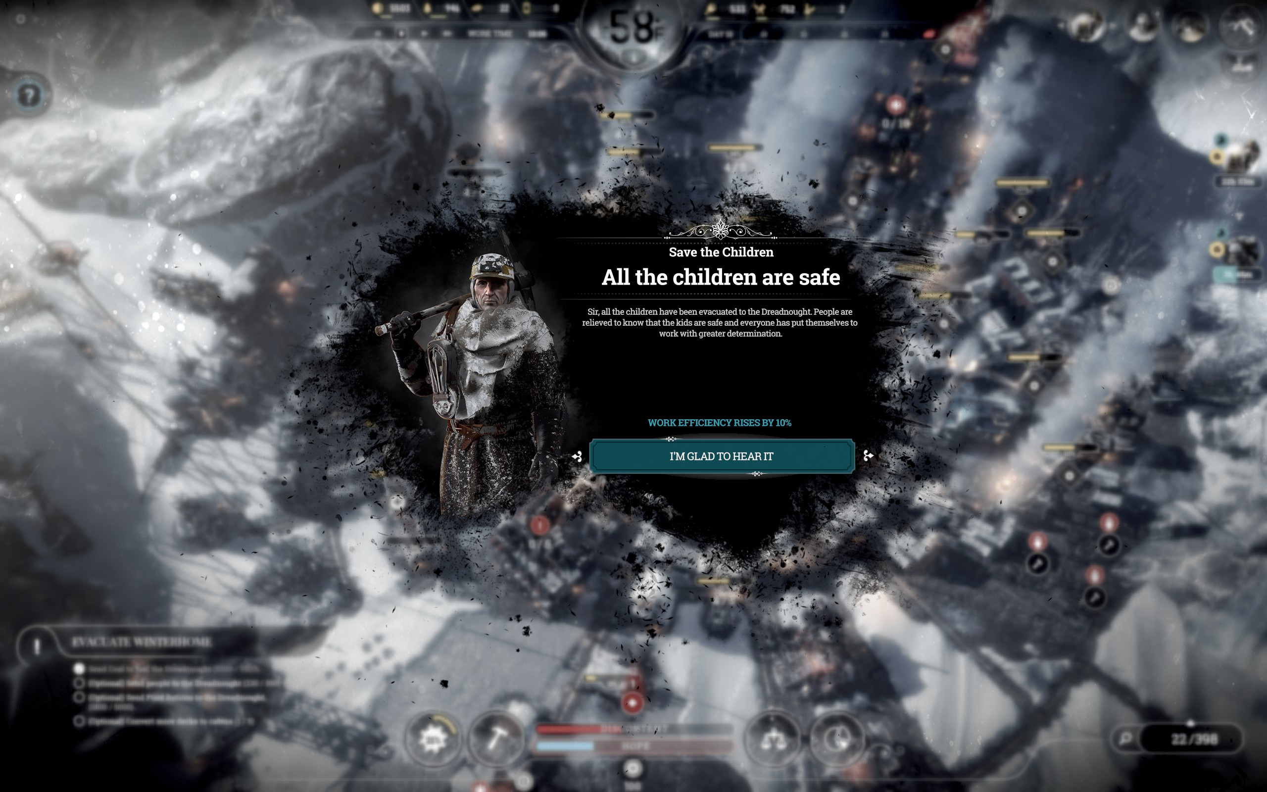 With the sum total of all that I have learned while playing various Frostpunk scenarios, I put the community’s children straight to work. They sift through the ruins for recyclable wood and steel. Able-bodied adults rebuild houses for warmth and erect medical posts to heal the injured. Sickness from the cold would snowball Winterfell Winterhome into an unrecoverable state. Then again, this scenario is “The Fall of Winterhome”; I am not actually supposed to save it. Sure enough, just when I think I have established societal homeostasis, the generator falters. With considerable effort, my engineers stabilize it, but the repair is temporary. With the generator in a terminal state, hope plummets, and denizens threaten rebellion. I cannot remember if the plan to evacuate via the Land Dreadnought from which the populace arrived was the idea of the engineering team, but I focused all energies towards the effort.