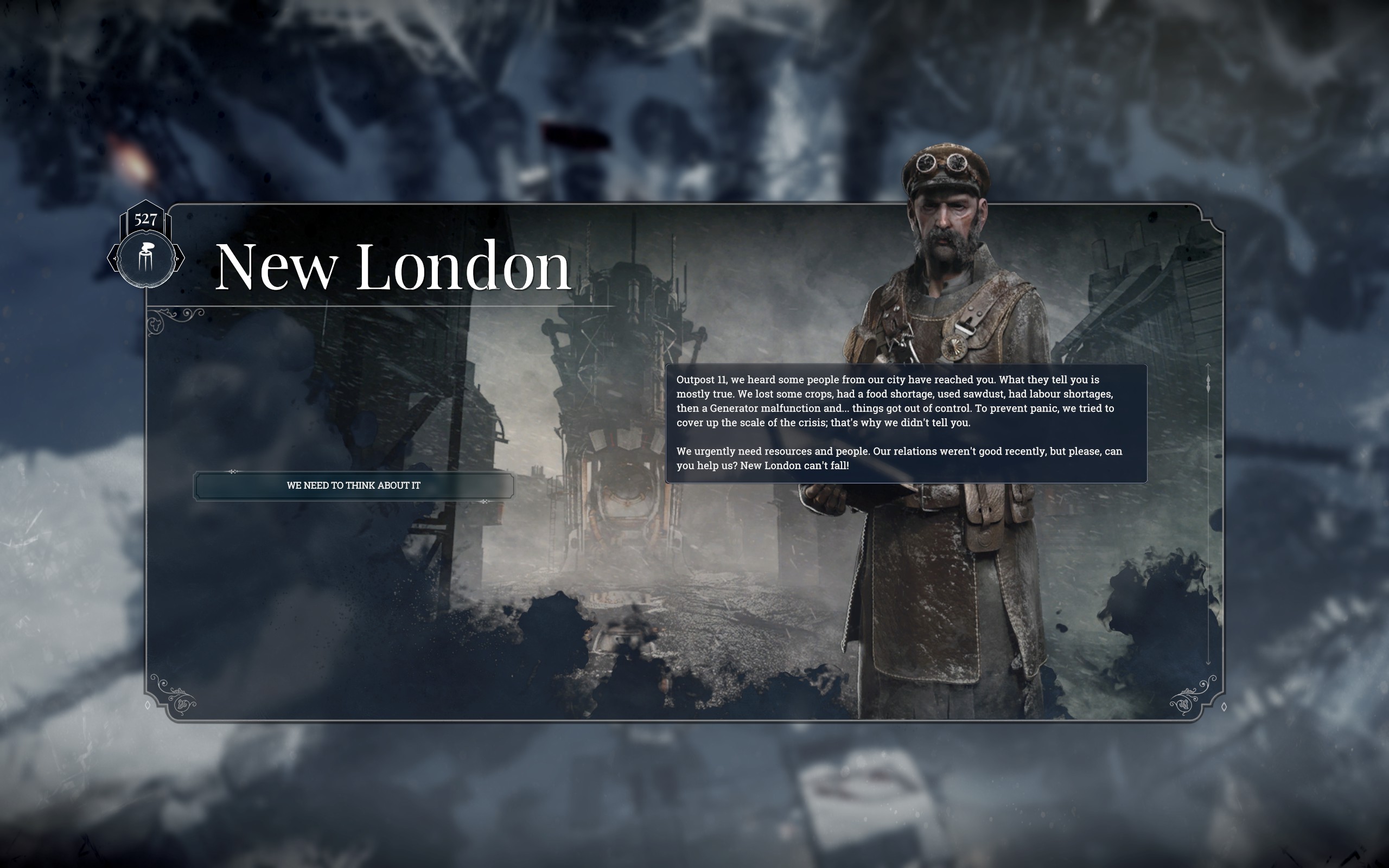 Canonically, the survivors of “A New Home” name their colony New London, and they send a team to Outpost 11 as New London has exhausted its ability to care for its own. Frostpunk hints this to players when New London sends the Outpost 11 their children unannounced. Because New London dictates Outpost 11’s technological and civic evolution, players have no method to research to solve problems, such as hunter’s huts for food. Eventually, New London becomes abusive and gaslighting, and I choose to break off and become independent. To sustain myself, I befriended two factions: some luddites for food, and some (ex)convicts for labor; I did not need the coal from the children’s mines. Eventually, New London asks me to save them, and because I am not an asshole like the dude who was barking orders at me, I did.