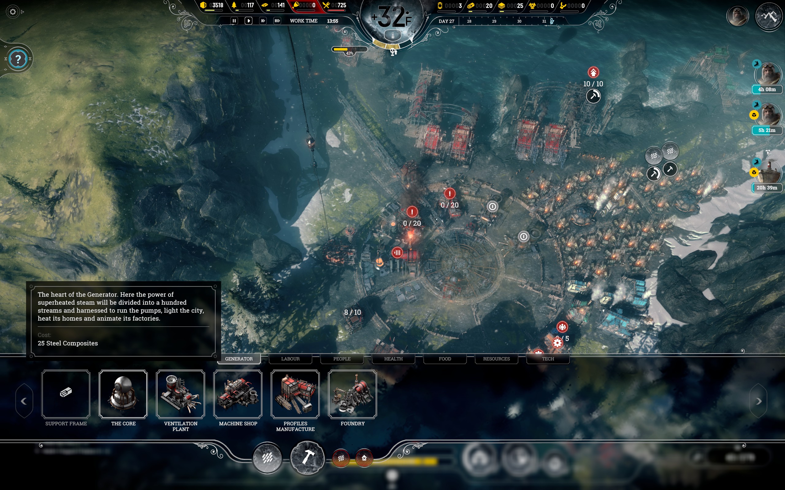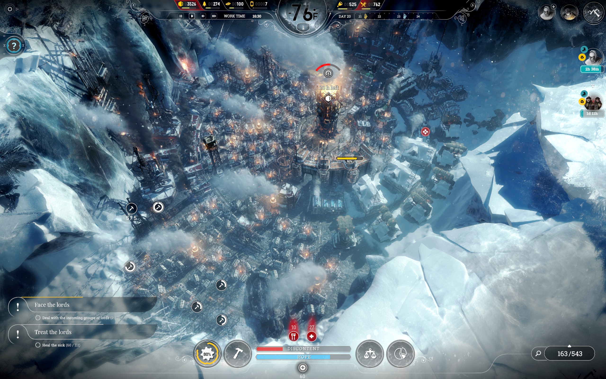 Frostpunk‘s gimmick—what makes it effective as a survival city builder sim—is players initially not knowing what to do. Mistakes make the gameplay, and Frostpunk‘s reticence to hold hands until after a crisis propagates them. By the time the game prompts players to provide solutions for necessities such as food or heat, they are behind schedule. The basic challenge of providing adequate food and shelter for the workers who cultivate the city bewilder enough, but managing sickness can snowball rapidly. Sick workers do not work, so the colony could fall into a deficit that is not readily detectable until an hour or two later of real-time gameplay when temperatures approaching absolute zero shut down the medical posts and ironically-named hothouses.